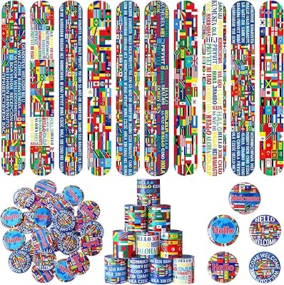 Outus 60 Pcs International Flags of The World Party Favors: 30 Around The World Slap Bracelets, 30 Button Pins, Country Flags International Party Favor Globe History Classroom Decorations Supplies